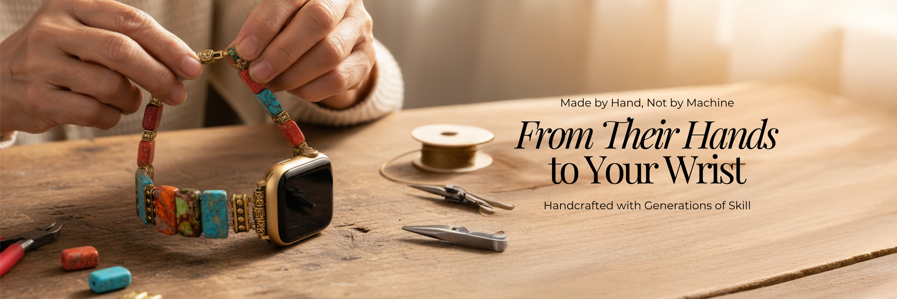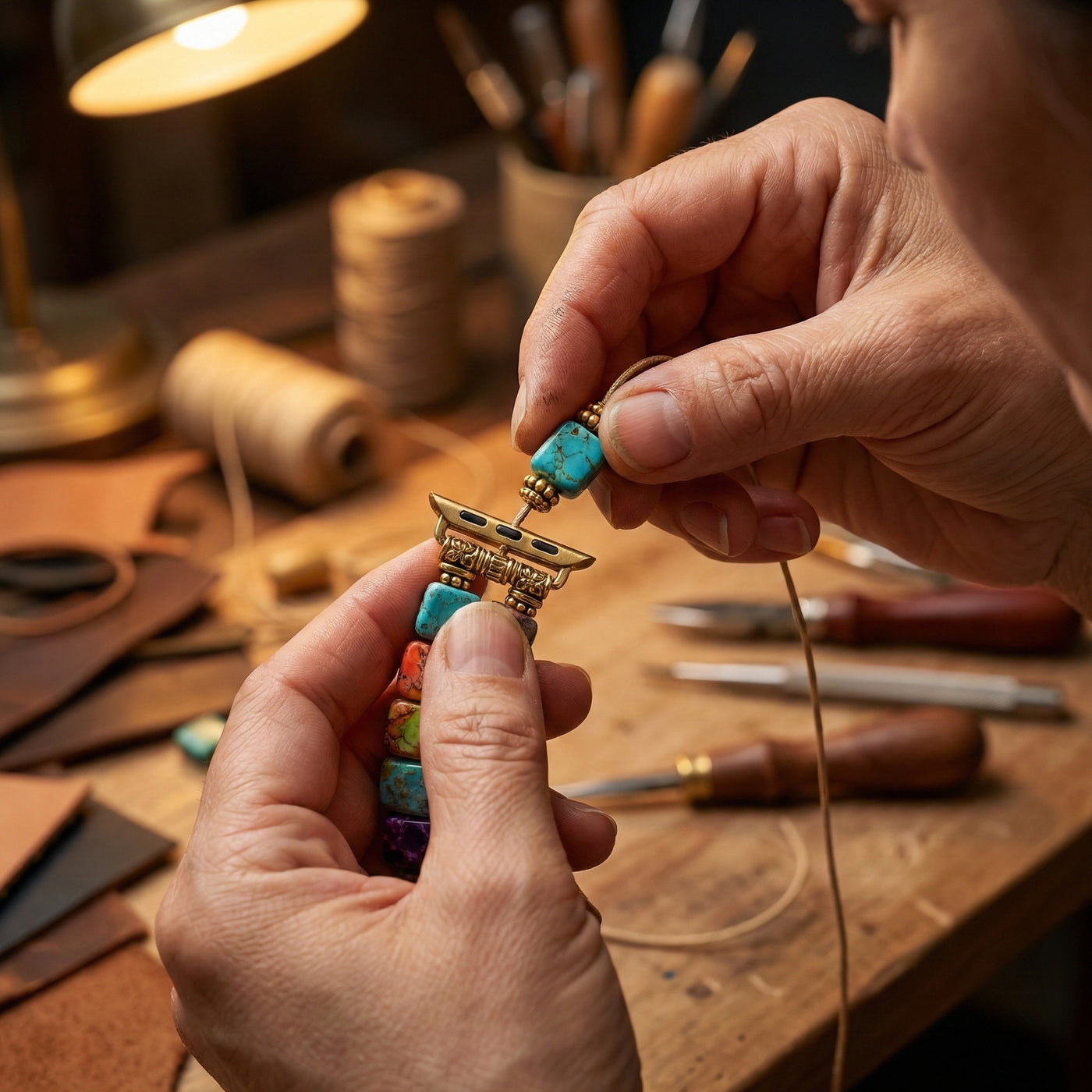 Je Apple Watch draag je elke dag — het verdient meer dan iets massaal geproduceerts. Elke band wordt met de hand in elkaar gezet door vaardige ambachtelijke moeders, met zorgvuldig uitgekozen stenen, nauwkeurig geplaatste kralen en doordacht geïntegreerde sluitingen voor stevigheid en duurzaamheid.