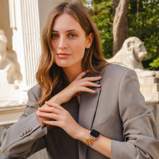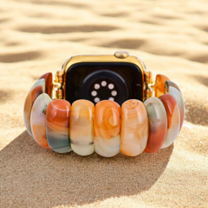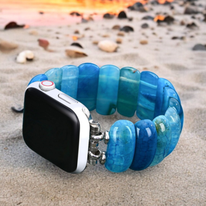 Breng je stijl naar een plek van serene schoonheid met de Amazonite Dream gevlochten Apple Watch-band. Deze prachtige band bevat rustgevende amazonietstenen, betoverende kattenoogstenen en fonkelende kristallen kralen, allemaal elegant verbonden met luxe goudkleurige kettingen.